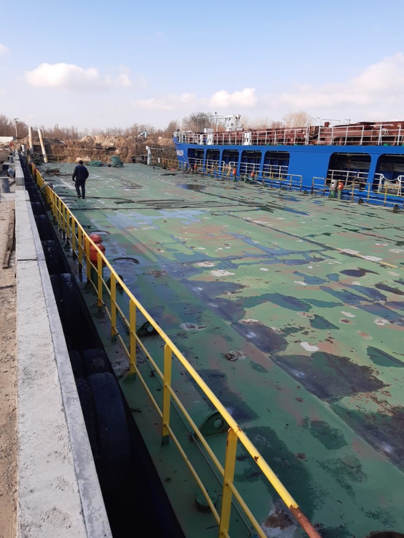 Баржа типа RORO позволяет провести горизонтальную погрузку/выгрузку через аппарели (три стальных листа толщиной 60мм шириной 2000мм длинной 6000мм). В кормовой части ширина зоны погрузки составляет 12,0м.